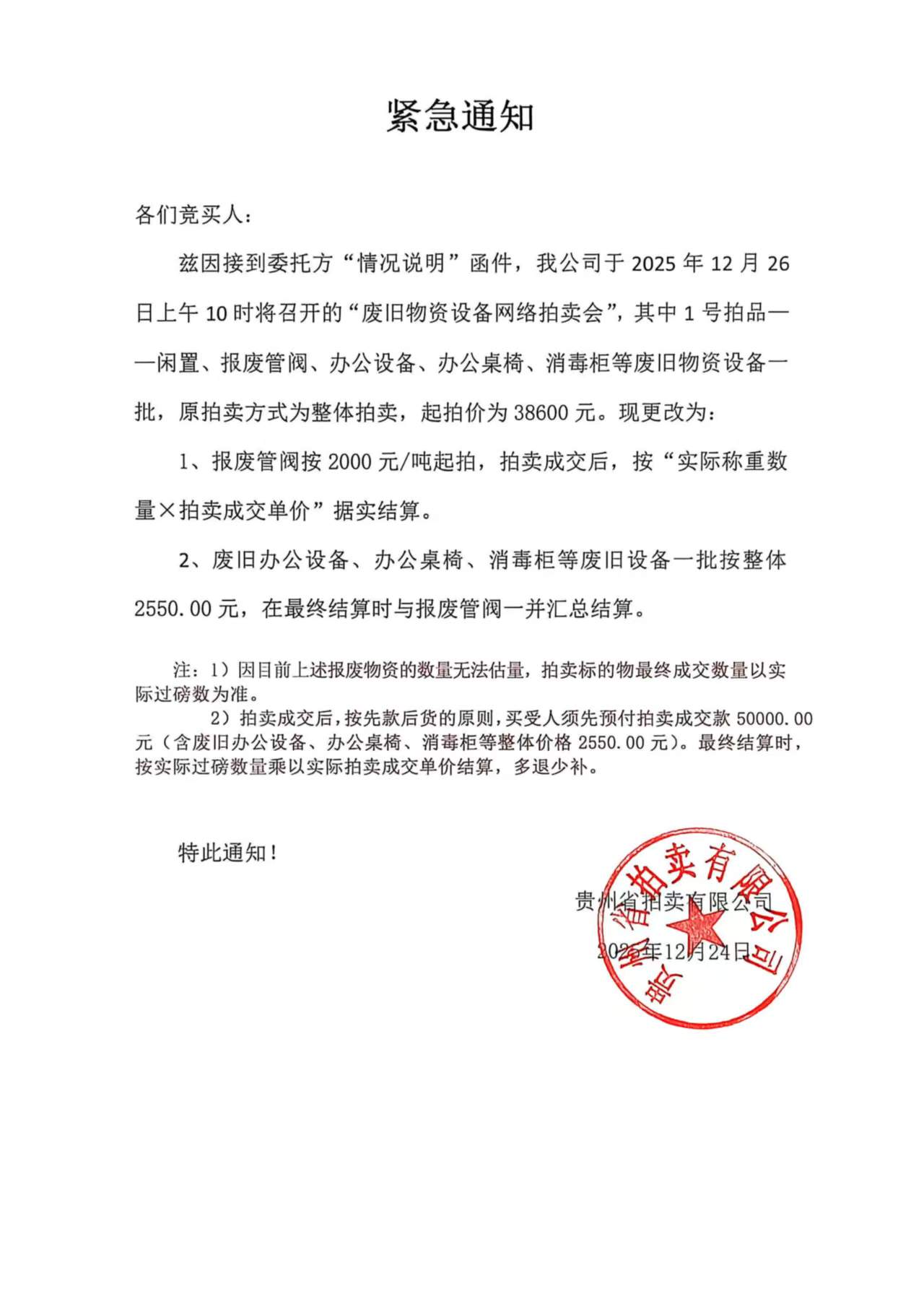关于12月26日拍卖会紧急通知